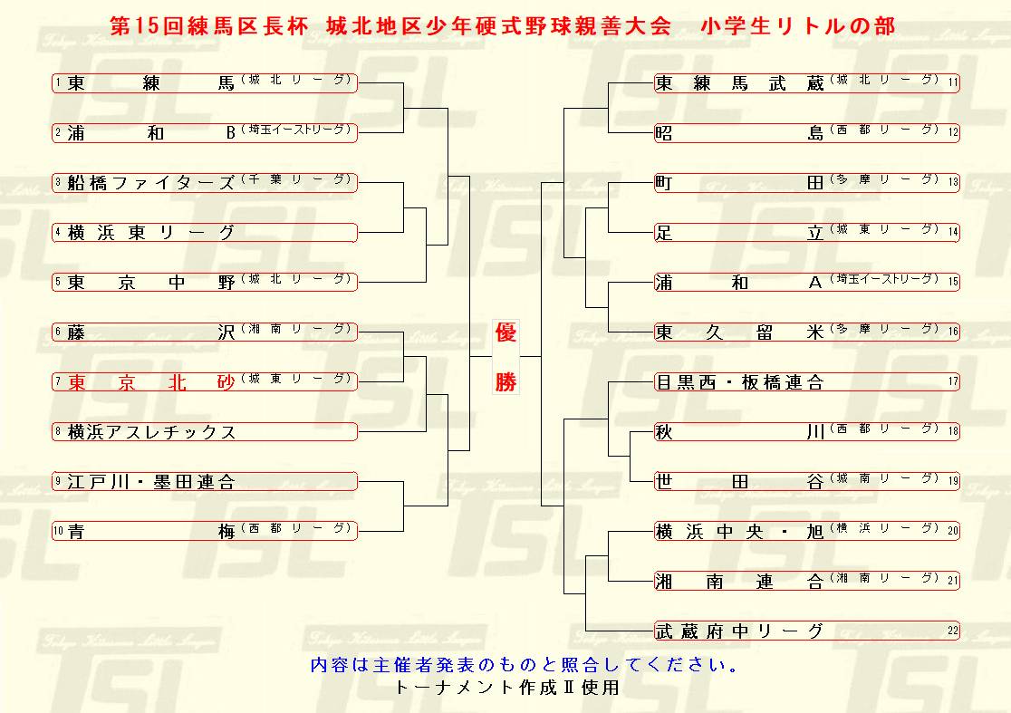 - 東京連盟大会 城東リーグ東京北砂チームはリトルリーグ東京連盟に属しています.東京連盟大会は,春,夏,秋に行われ,優勝,準優勝チームは関東大会,東日本大会,全日本選抜大会に出場します。