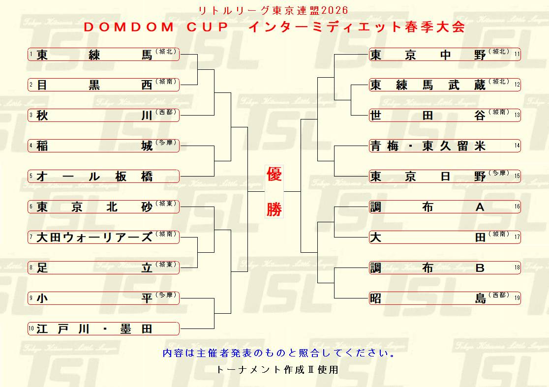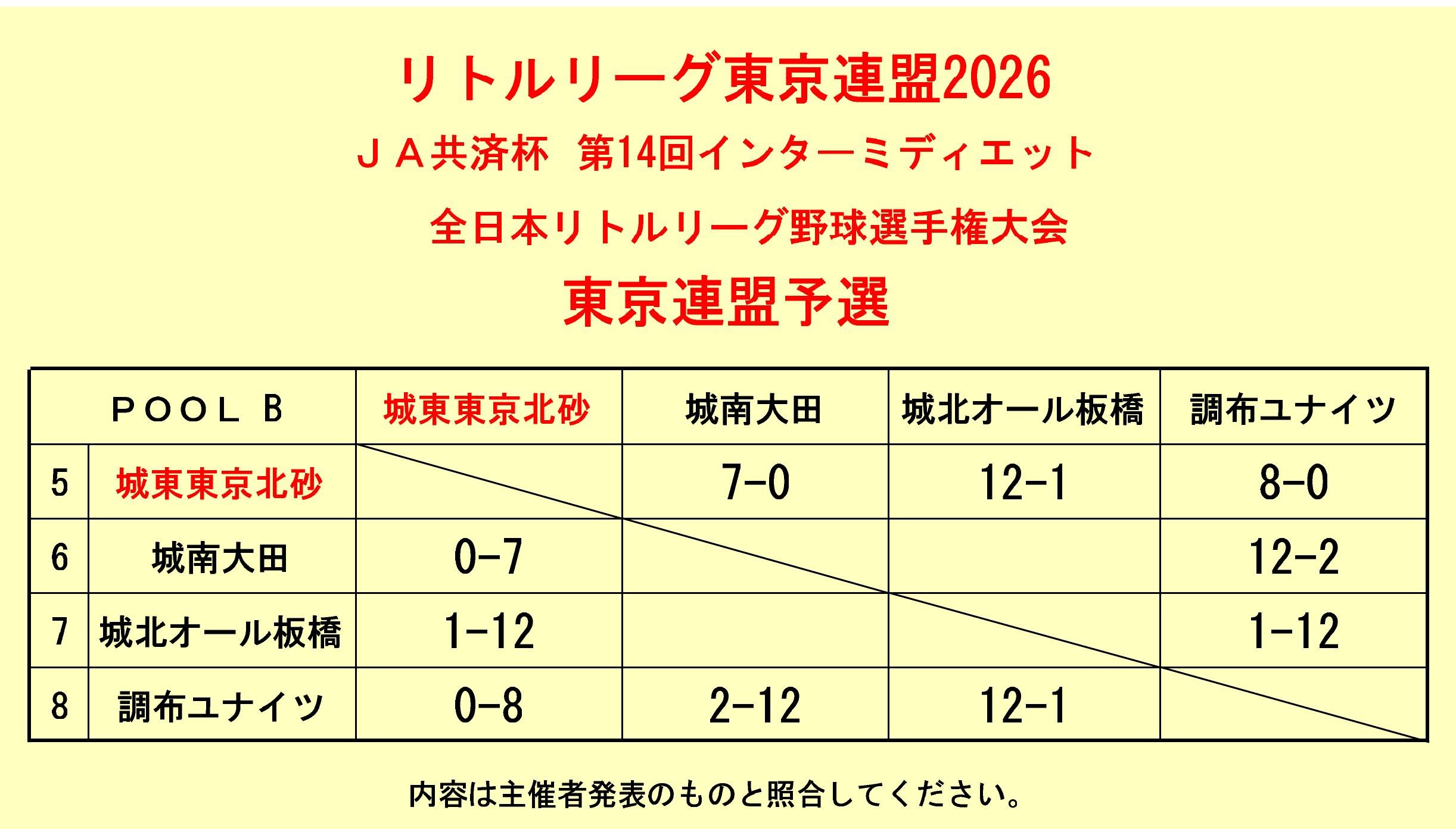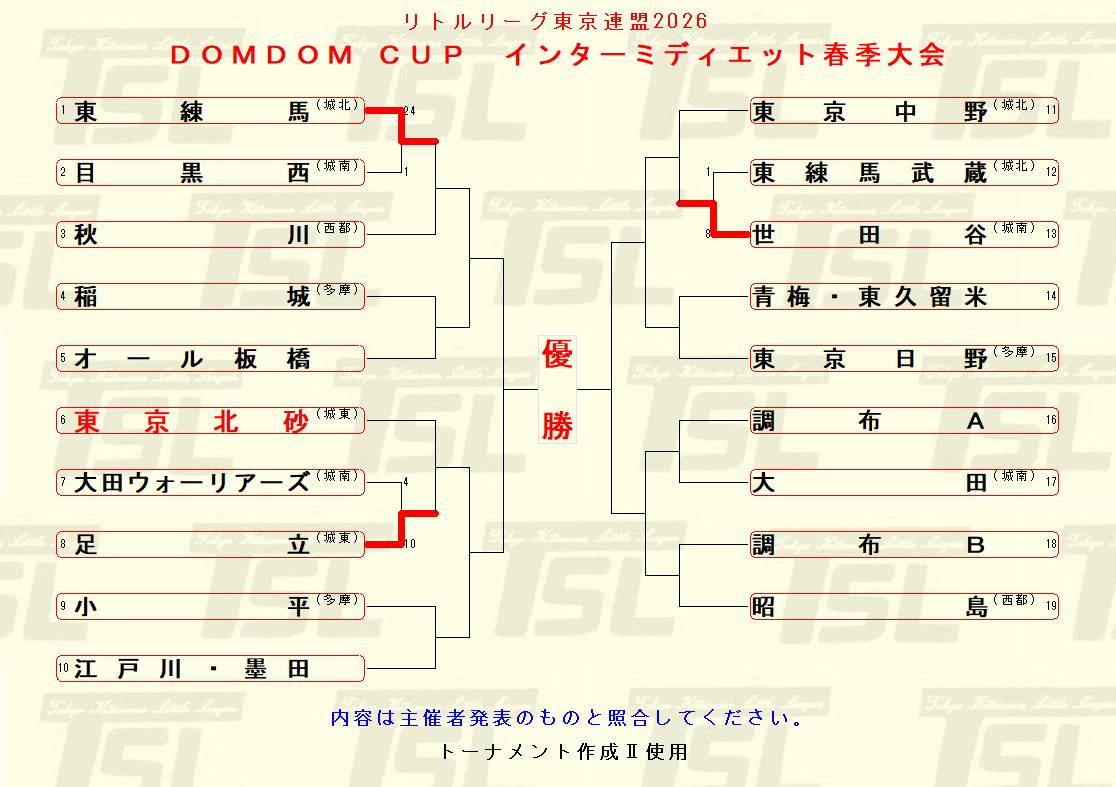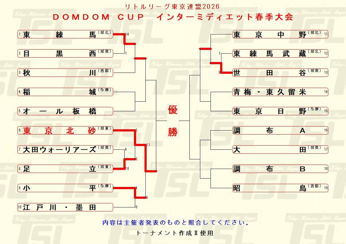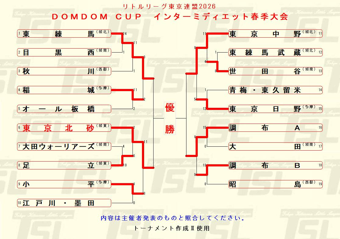 - 東京連盟大会 城東リーグ東京北砂チームはリトルリーグ東京連盟に属しています.東京連盟大会は,春,夏,秋に行われ,優勝,準優勝チームは関東大会,東日本大会,全日本選抜大会に出場します。