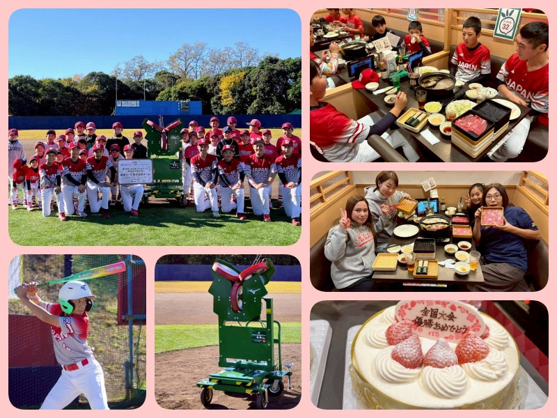 午前中は北砂グラウンドにて、全日本選手権優勝の記念品として贈呈されたピッチングマシンの贈呈式を実施しました。選手整列ののち、ご挨拶、記念品贈呈、記念撮影が行われ、実際にマシンのお披露目と試打も行われました。最新のマシンを前に、選手たちは目を輝かせながらバッティングを楽しんでいました。